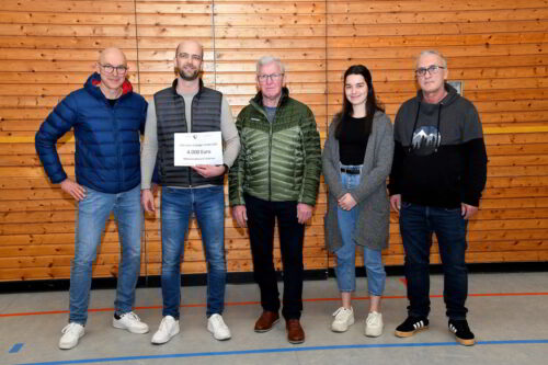 Im Rahmen des Fußballhallenturniers des FC Ottenhöfen haben die Verantwortlichen für das Lukas-Sehlinger-Gedächtnisturnier eine Spende von 4000 Euro an die Mukoviszidose e.V. Regionalgruppe Ortenau übergeben. Johannes Schneider (2.v.l.) durfte die Spende entgegennehmen und dankte herzlich. Das Lukas-Sehlinger-Gedächtnisturnier, ein Benefizturnier für ein 2004 verstorbenen Jugendspieler des FC Ottenhöfen, fand wie in den vergangenen Jahren im Dezember in der Mummelseehalle in Seebach statt. Der Erlös aus diesem Turnier erbrachte die Spendensumme.